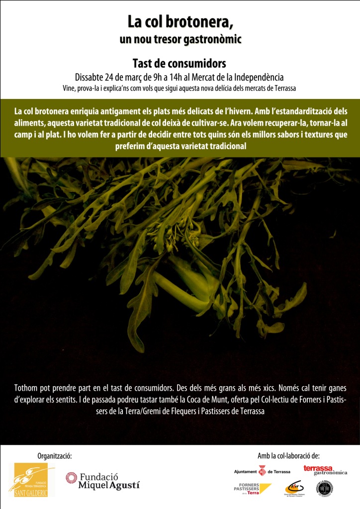 Antigament la col brotonera era molt apreciada a la cuina catalana i es podia trobar a la major part de mercats de la Catalunya Central i del litoral barcelon�. Des de fa anys, per�, s’ha deixat de cultivar, i nom�s la conserven alguns agricultors gaireb� per autoconsum. La Fundaci� Terrassenca Sant Galderic i la Fundaci� Miquel Agust� s’han fixat en aquest producte singular, i inicien un projecte per recuperar el seu cultiu als camps agr�coles de Terrassa. L’objectiu �s promoure el cultiu d’aquesta varietat tradicional com a emblema de l’agricultura local, prevenint la p�rdua de biodiversitat que sofreix l’agricultura. I tamb� tornar a enlla�ar, a trav�s d’un producte emblem�tic, els terrassencs amb els seus agricultors, fomentant una agricultura de proximitat.